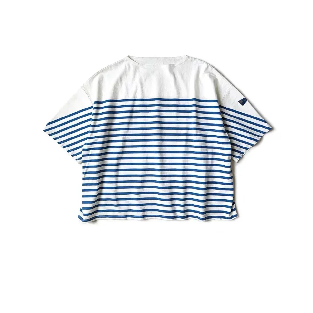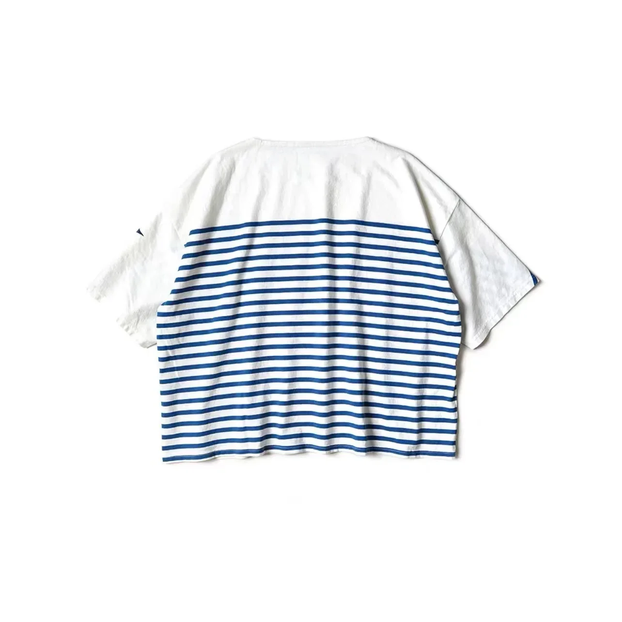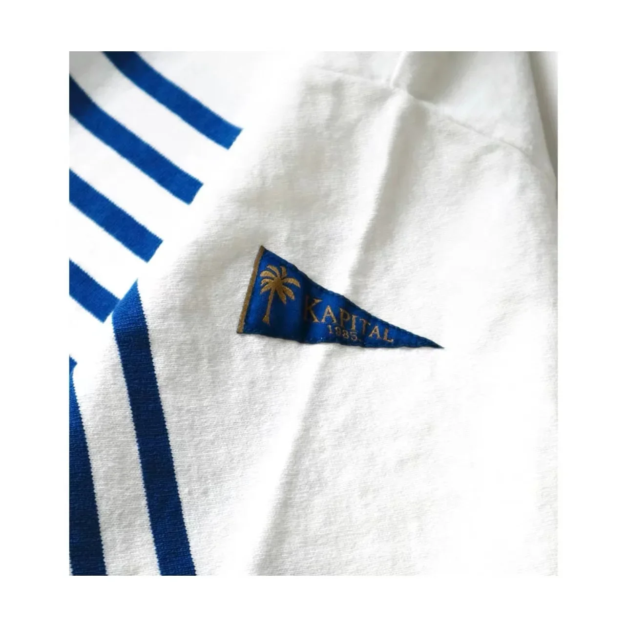 22SS KAPITAL Hirata Kazuhiro Blue and White Striped Color Matching Loose Three Flag Round Neck Short Sleeved T-shirt Men New