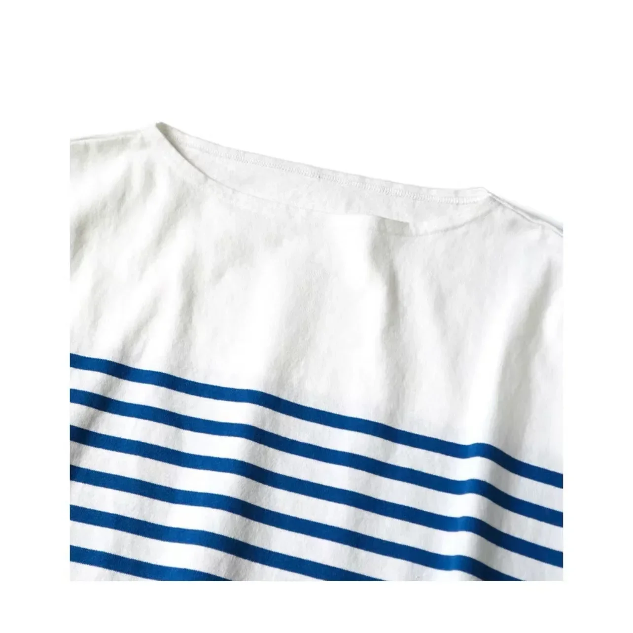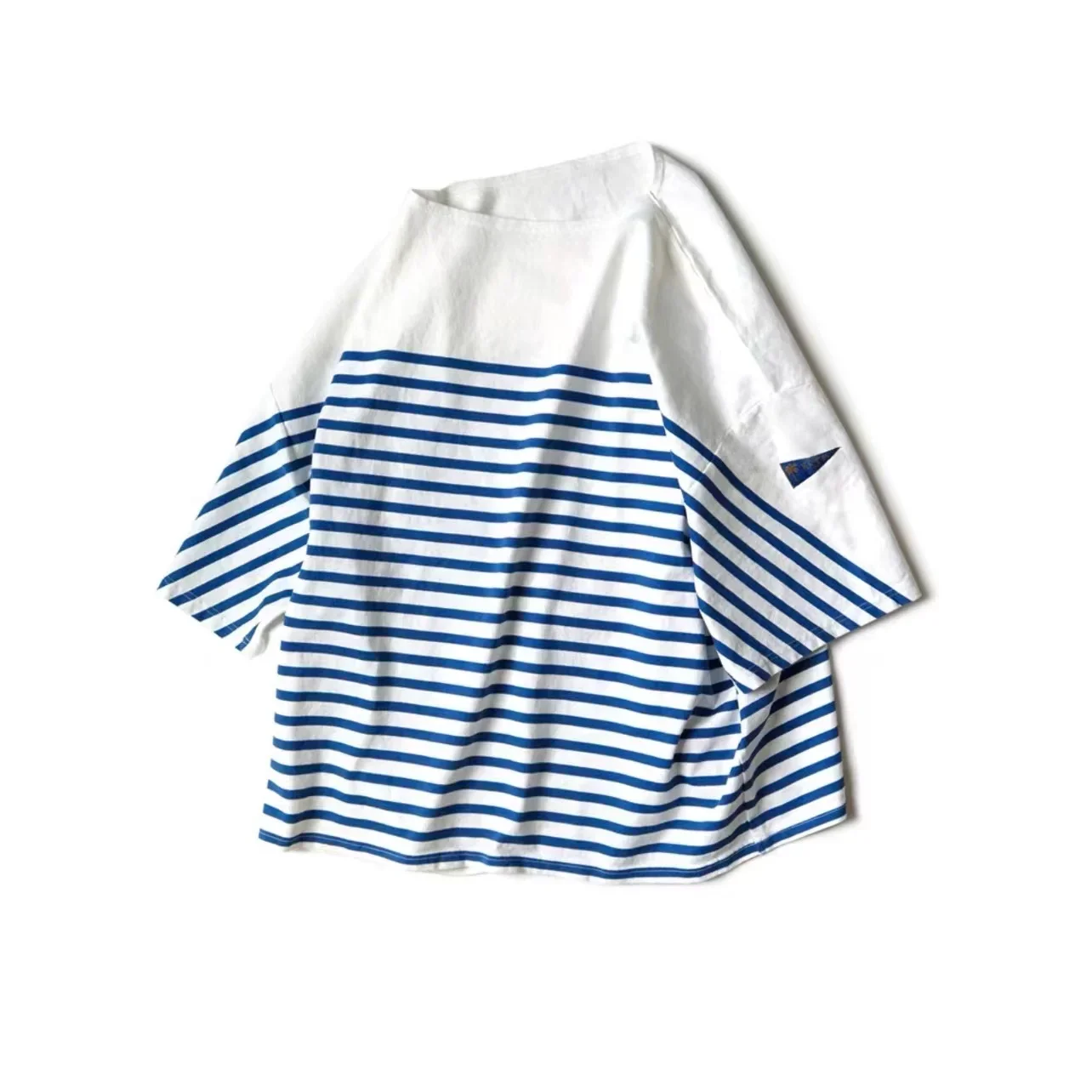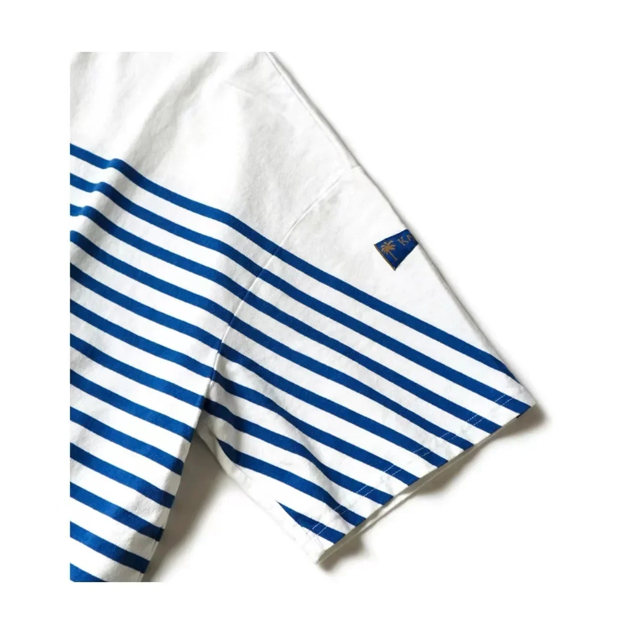 22SS KAPITAL Hirata Kazuhiro Blue and White Striped Color Matching Loose Three Flag Round Neck Short Sleeved T-shirt Men New