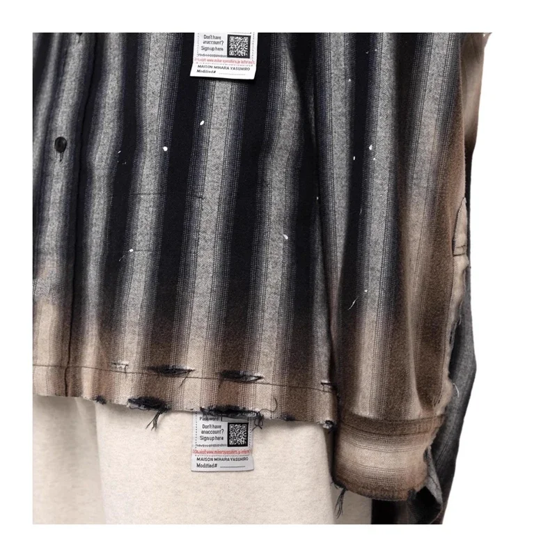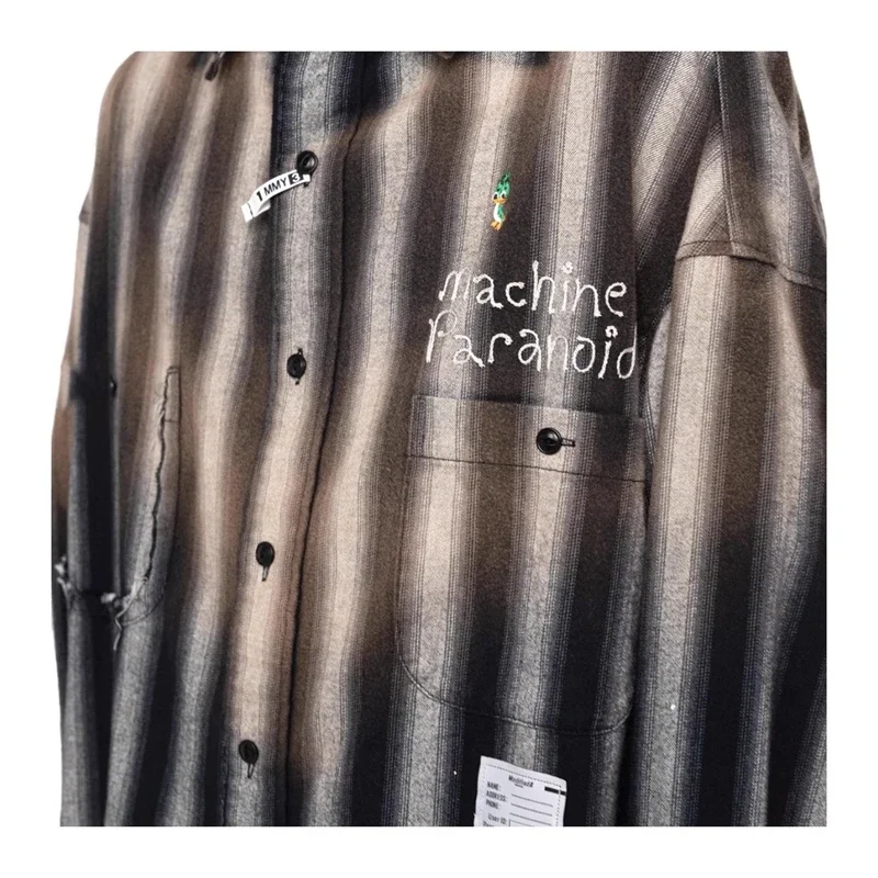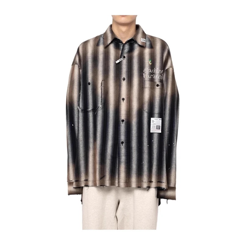 24AW Japanese Casual Pure Cotton Striped Duck Embroidered Vintage Loose Shirt Long Sleeved Distressed Plaid Top
