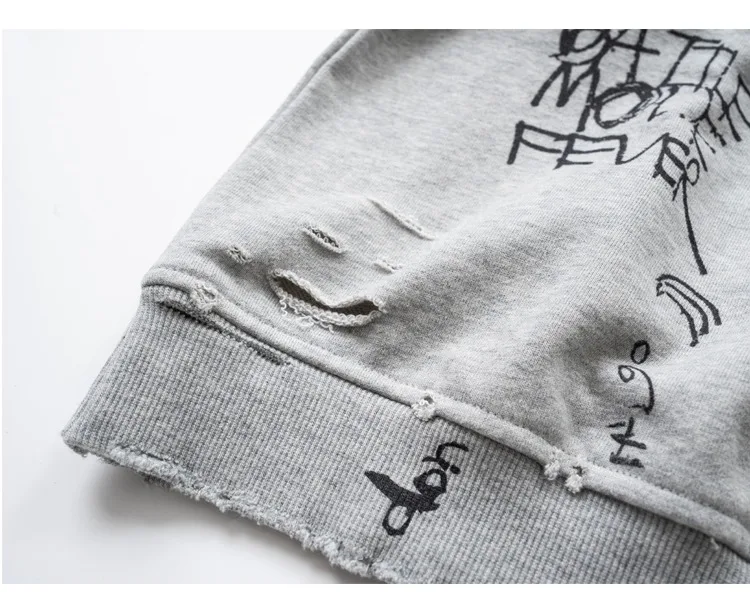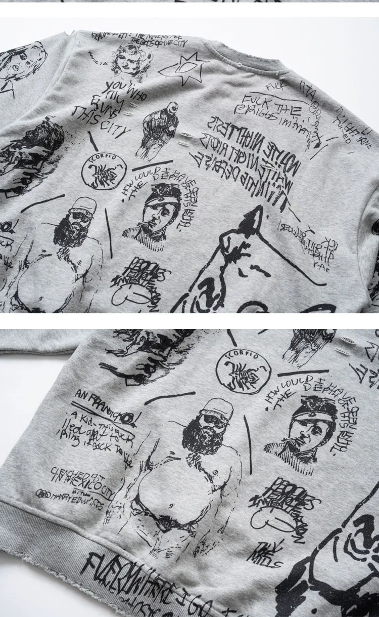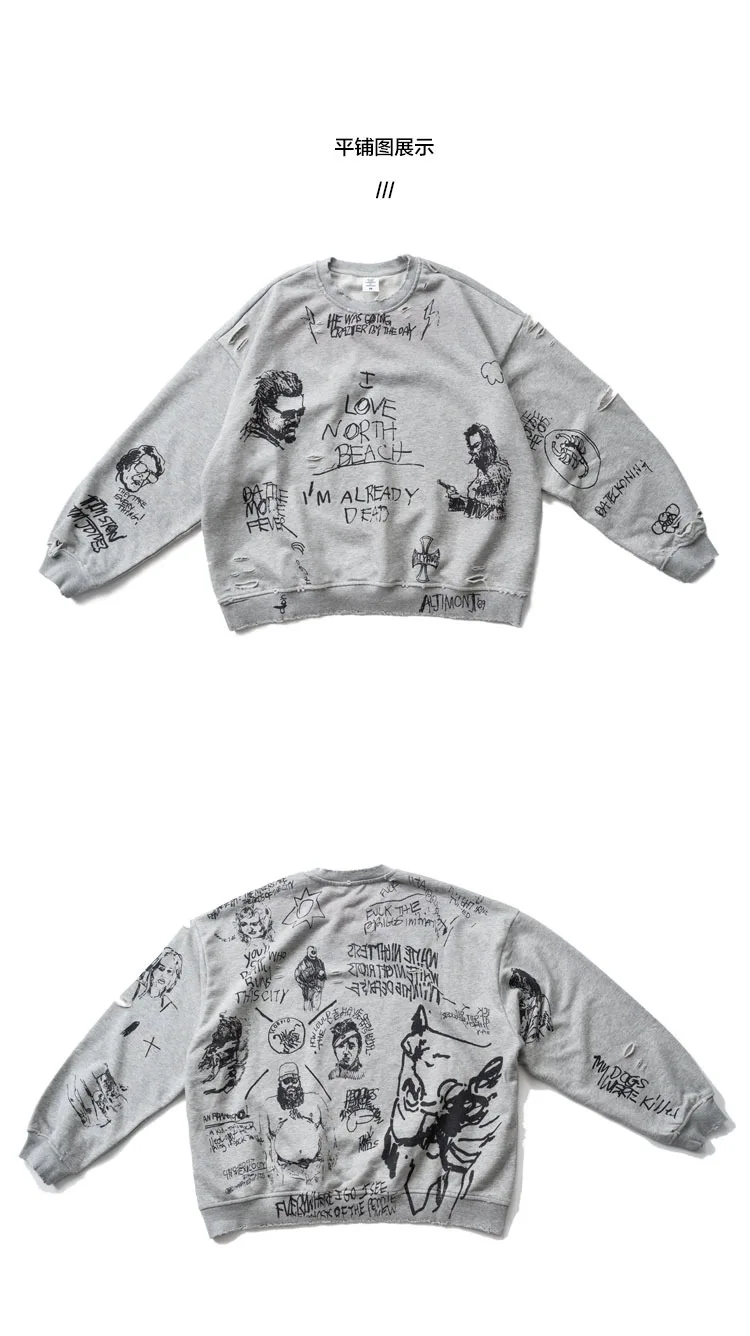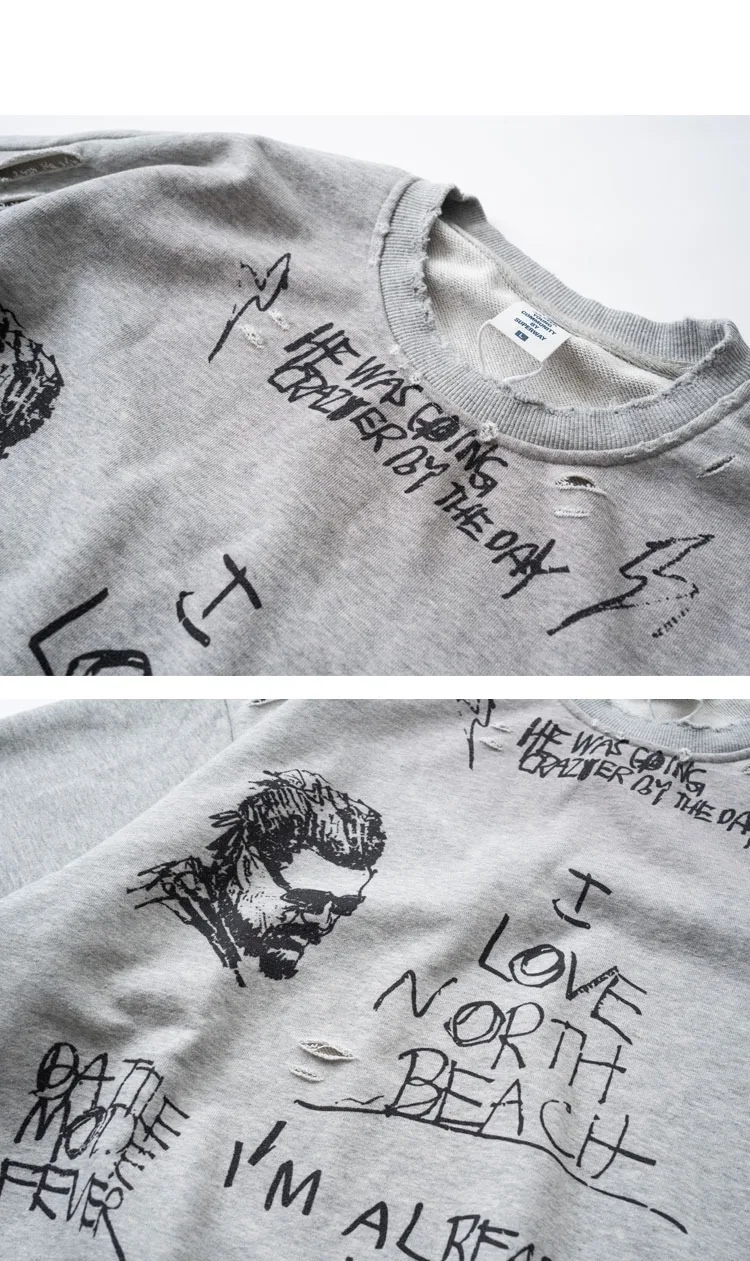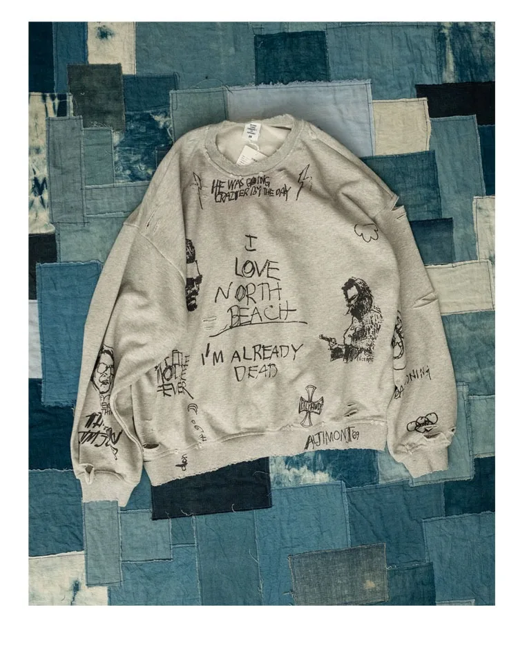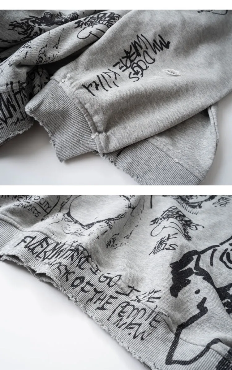 American Retro Washed Distressed Hand Drawn Graffiti Printed Round Neck Hoodie for Men and Women Loose Casual Top