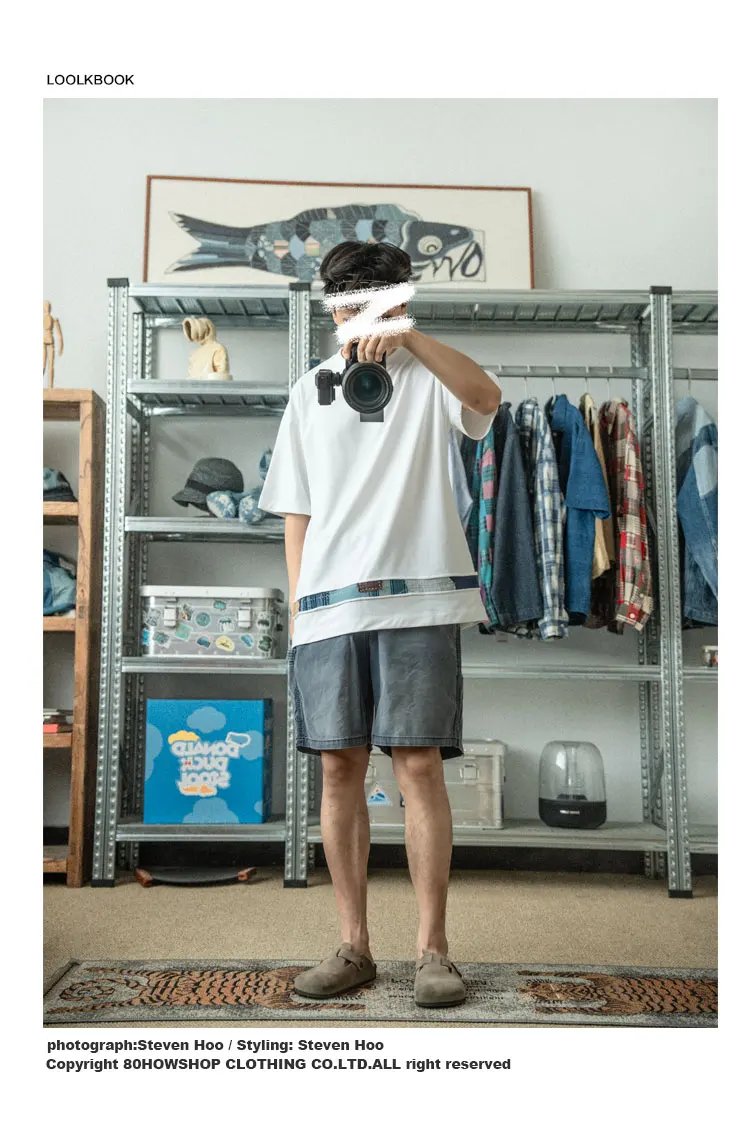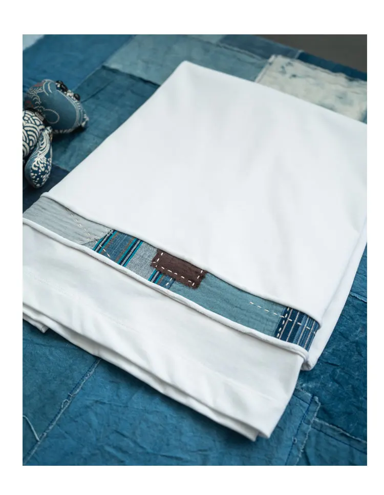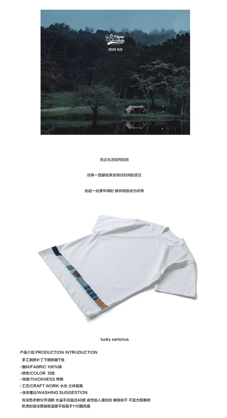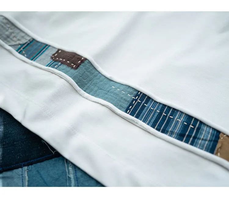 Indigo Retro Handmade Embroidery Patch Fabric Splicing Cotton Round Neck Short Sleeved T-shirt Men's and Women's Trendy Tees