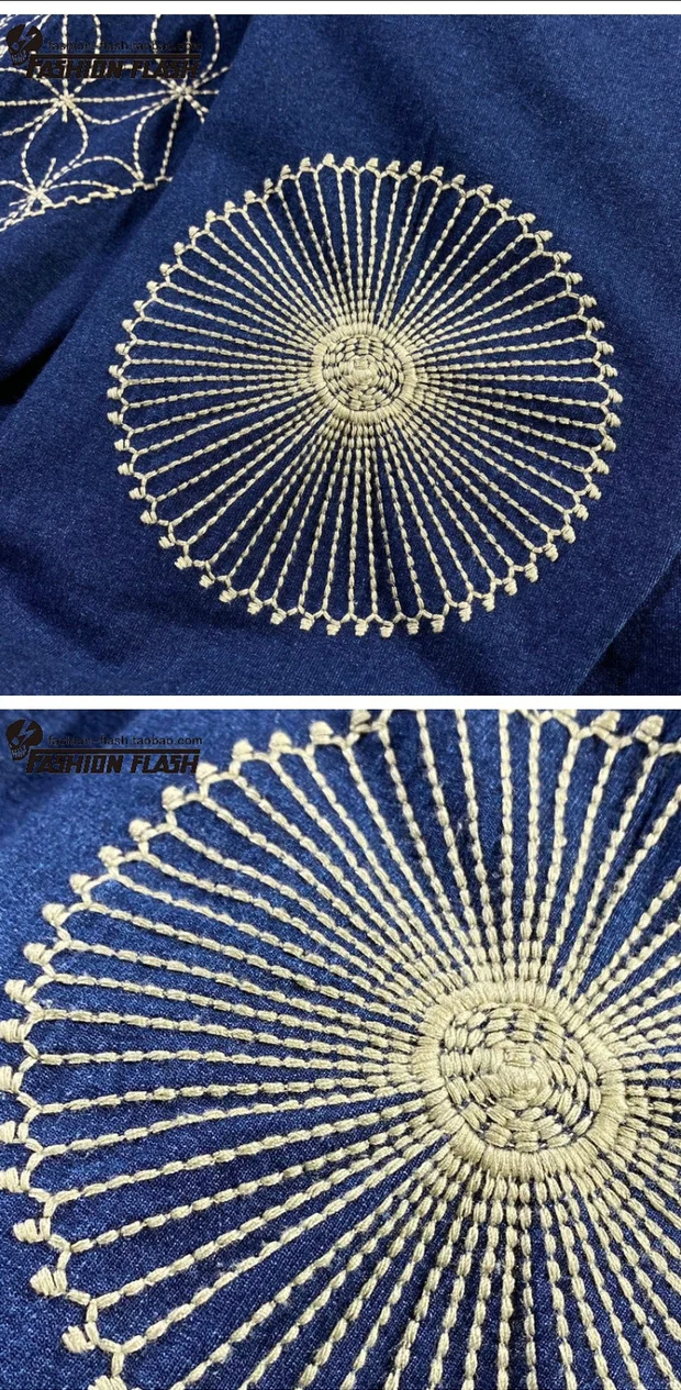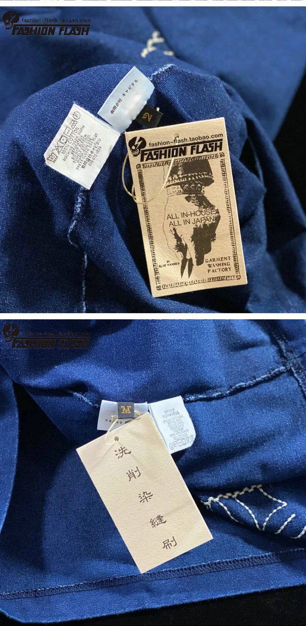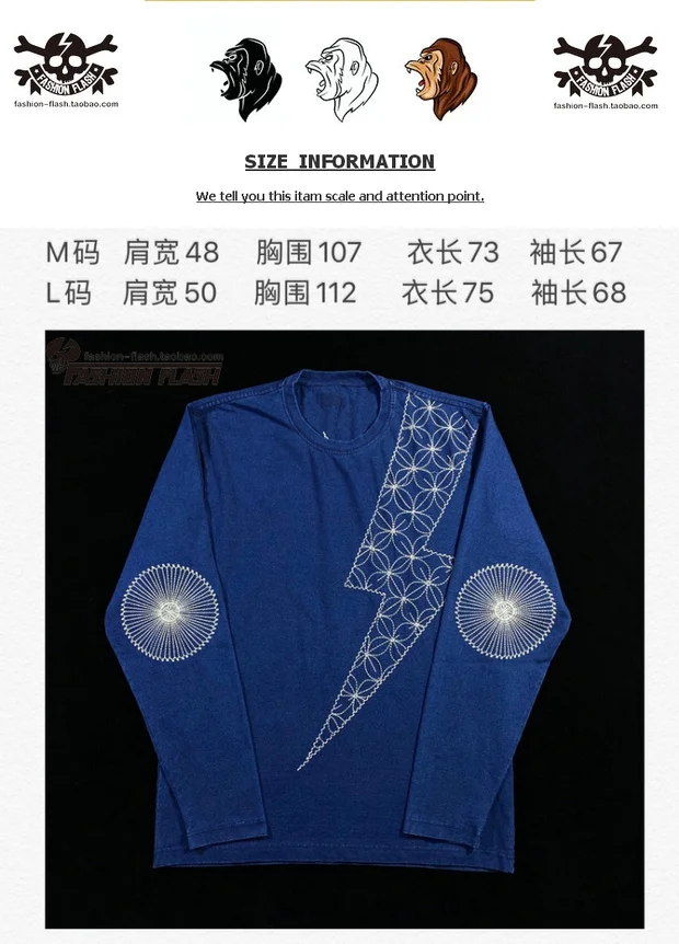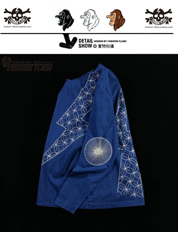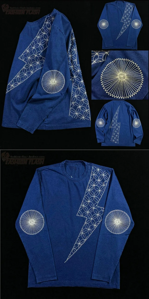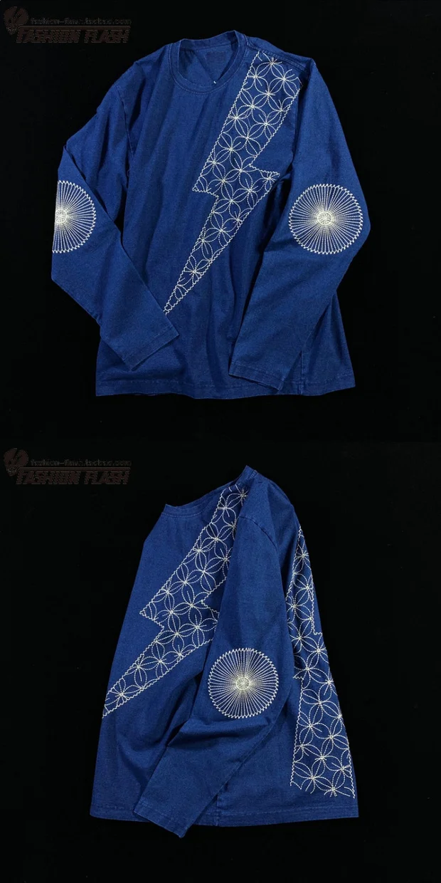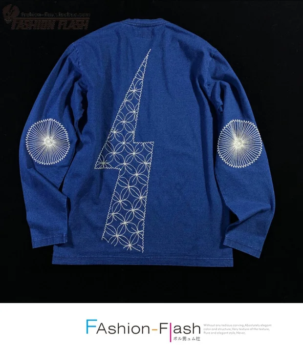 KAPITAL Hirata Kazuhiro's New Japanese Blue Dye Embroidered Lightning Retro Trend Casual Long Sleeved T-shirt for Men